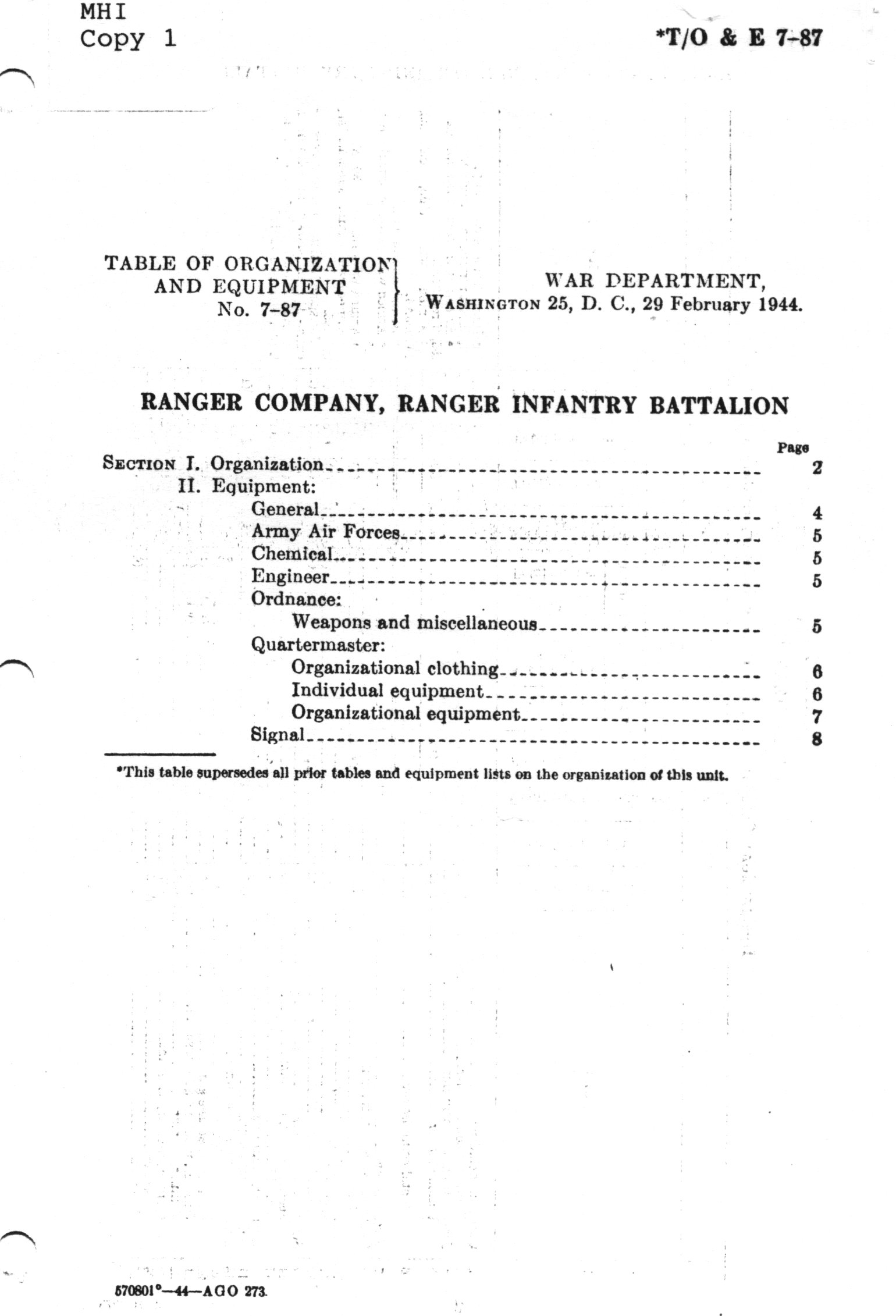 Page 1, T/O&E 7-87 "Ranger Company, Ranger Infantry Battalion", dated 29 February 1944