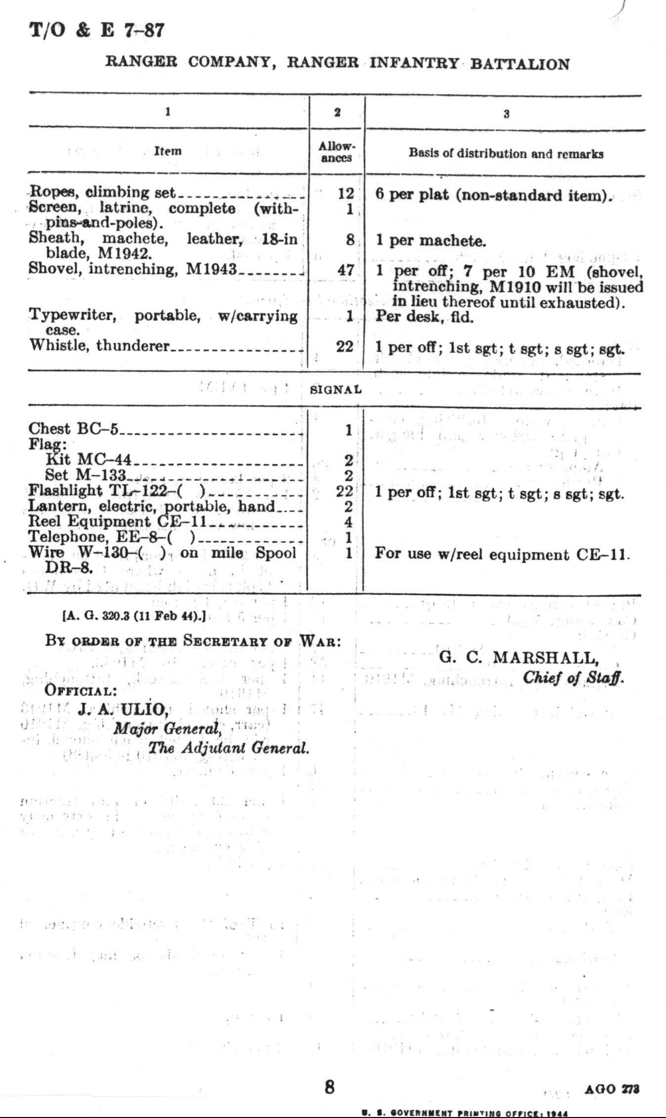 Page 8, T/O&E 7-87 "Ranger Company, Ranger Infantry Battalion", dated 29 February 1944